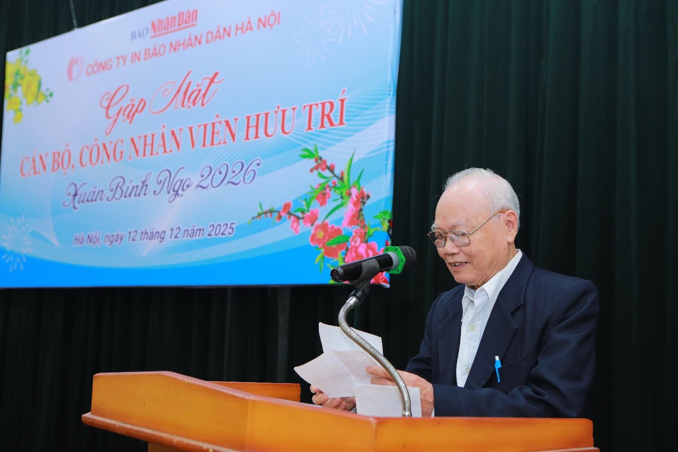 Sáng 12/12/2025, tại trụ sở 15 Hàng Tre, Công ty In Báo Nhân Dân Hà Nội đã tổ chức buổi gặp mặt toàn thể cán bộ hưu trí. Đây là hoạt động được Công ty tổ chức thường niên, là dịp để tri ân những đóng góp to lớn của các thế hệ đi trước và chia sẻ những bước phát triển mới của công ty. Tham dự buổi gặp mặt có các đồng chí nguyên là lãnh đạo công ty qua các thời kỳ và khoảng 120 cán bộ hưu trí, đại diện cho 146 cán bộ hưu trí và 7 gia đình thương binh liệt sĩ toàn công ty. Về phía Công ty có đồng chí Trần Thị Kiều Thanh Bình, Bí thư Đảng ủy, Chủ tịch Công ty; đồng chí Trần Quốc Việt, Phó Bí thư Đảng ủy, Phó Giám đốc Công ty và đại diện Ban Chấp hành Công đoàn, Đoàn Thanh niên, cán bộ các phòng, phân xưởng của Công ty. Trong không khí thân mật, đầm ấm và đầy ý nghĩa, thay mặt Đảng ủy, Ban Lãnh đạo Công ty, cùng toàn thể cán bộ, công nhân viên, người lao động, đồng chí Trần Thị Kiều Thanh Bình bày tỏ vui mừng khi được gặp mặt các thế hệ cán bộ hưu trí của Công ty. Đồng chí gửi lời chúc sức khỏe và cảm ơn sâu sắc đến các thế hệ cán bộ hưu trí đã luôn quan tâm, đồng hành cùng sự phát triển của Công ty.